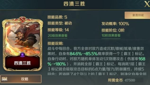 技能分析还是以控制队为例,战魂项羽作为主力输出,自然需要搭配的是伤害技能,通过自带技能吸取敌方属性和队友提供的控制效果的前提下,发动【猛虎破柙】和【黄巾起义】这类输出型技能,在造成伤害的同时触发其技能效果,对敌方施加禁疗和自身力量属性提升。