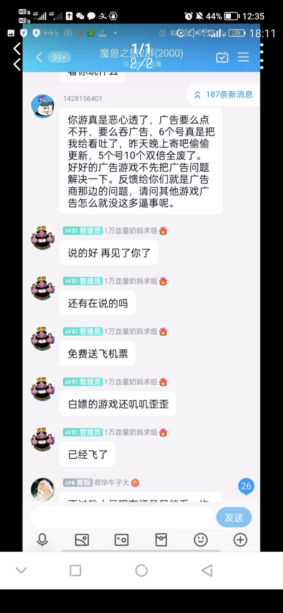 第二个帖子爆出来了一张图,显示的是在群里说广告问题没修复,不爽,然后被管理踢了。按我说踢了就踢了,很正常,但是管理踢完之后发泄式的威慑其他群友,暴露了游戏制作团队的态度,就是玩家都是欠团队的,爱玩玩不玩滚。这一波得罪了不少莫名其妙玩家。