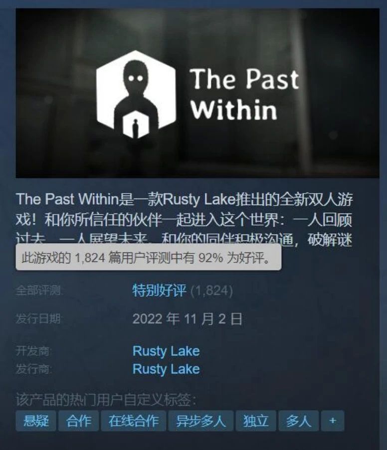 Steam最近上了款叫做《过去之间(The past within)》的游戏。它算不上什么大作,封面也不大亮眼。很容易让人下意识选择略过。就像最近一直沉迷COD的我,一开始被这游戏吸引,也纯粹只是因为游戏那非同一般的好评率。