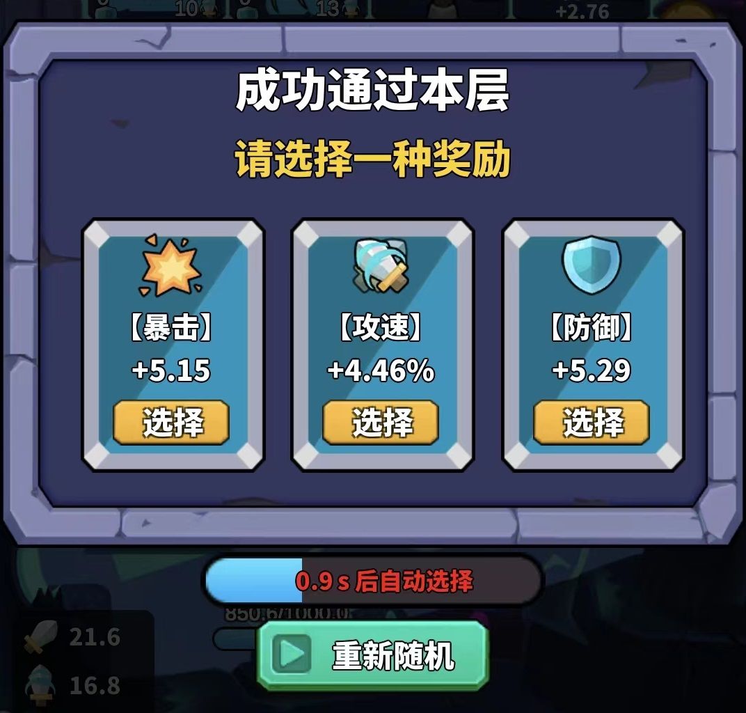 每上一层,会随出3个加属性的奖励,如下图,可在其中选择一种自己想要的,都没有的话也可以看广告重新随机: