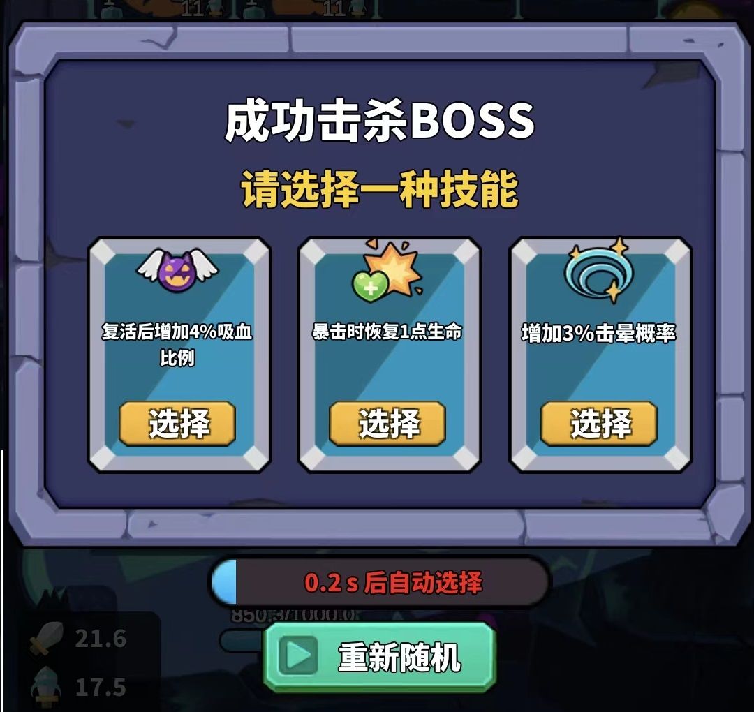 消灭完boss后随机出现3个技能,可以从中挑选一个或重新随机。