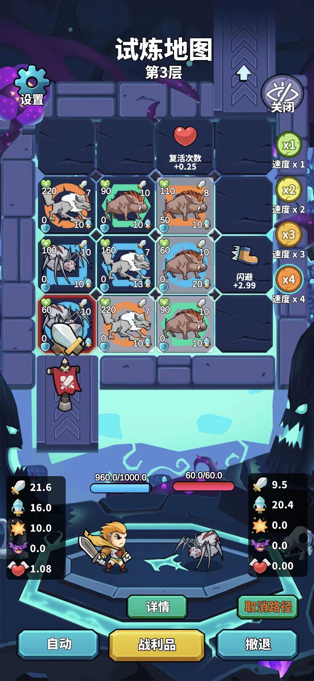 这是本游戏比较有特色的一个设计。每层3*3的格子上会随机一个怪物,同时格子上有某种颜色的几何形状。当一行或一列的3格有某一元素(怪物/颜色/形状)全部相同时,会出现奖励。消灭完对应全部3格的怪物后可获得奖励。例如上图第2行都是蓝色,奖励是加闪避;最右列都是野猪,奖励是加复活。这时就需要根据自己的需求选择前进路线了。