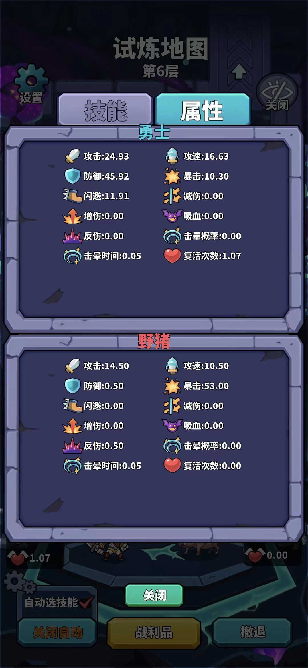 主界面点击英雄-详情(在属性右边),或冒险中点击详情按钮(战利品按钮上面),可以查看英雄当前的属性。