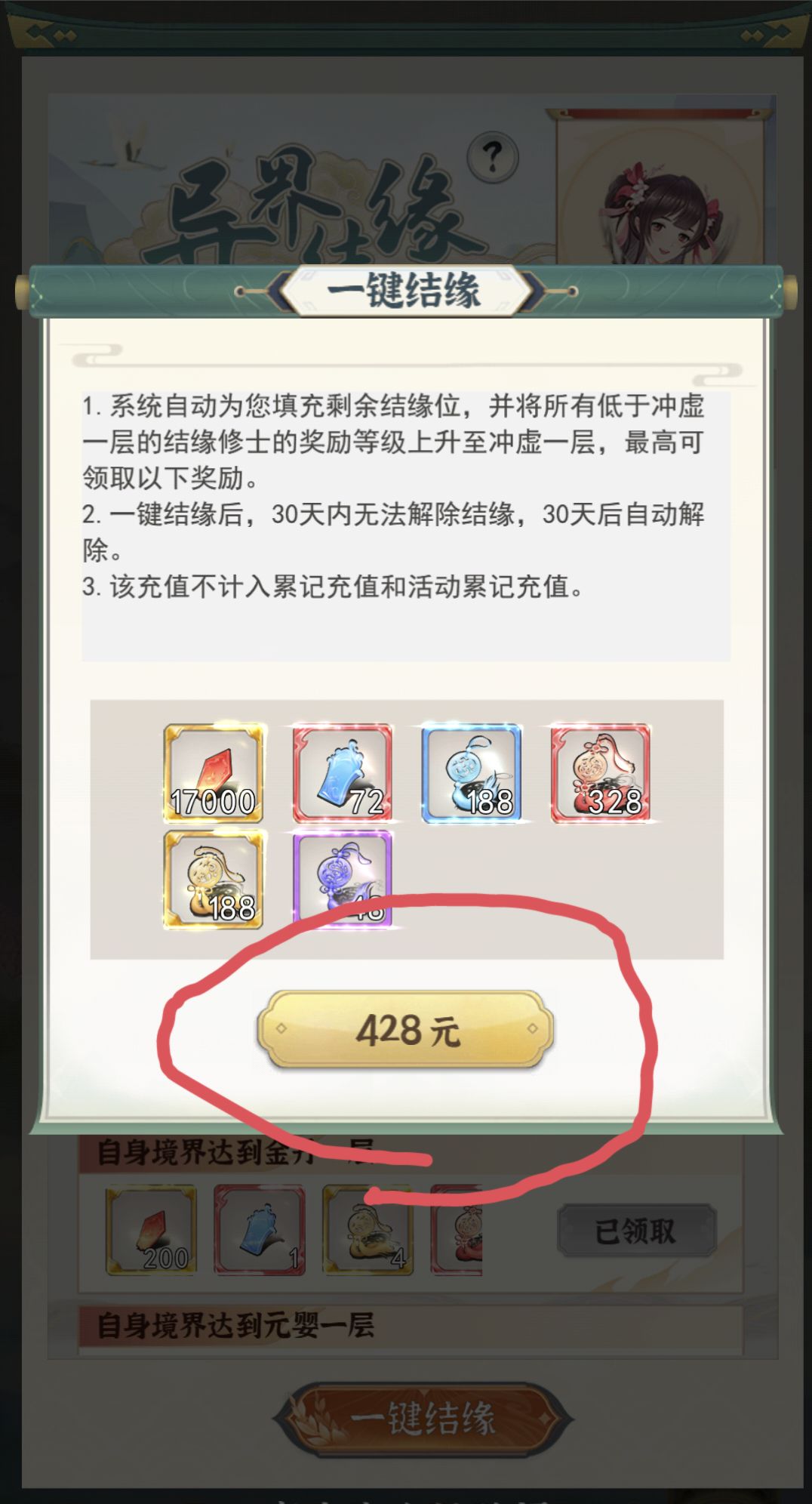 本来不想做这个攻略的,但是看到官方不知不觉加了这个“一键结缘428元”之后,还是忍不住做了这篇攻略,告诫0氪玩家和微氪玩家,这是个大坑,可以白嫖!!!![[嗒啦啦4_好耶]](https://img.tapimg.com/market/images/d378b7a8f38cae2d3dfb6170d918238b.gif)