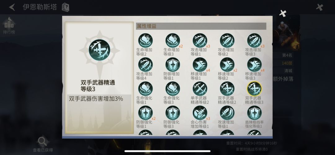 需要注意的是,双手武器不要选如带冰冻,迟缓等效果的技能,选了就恭喜你增加了爬塔难度(爬塔过程中需要聚怪,选了会聚不了)