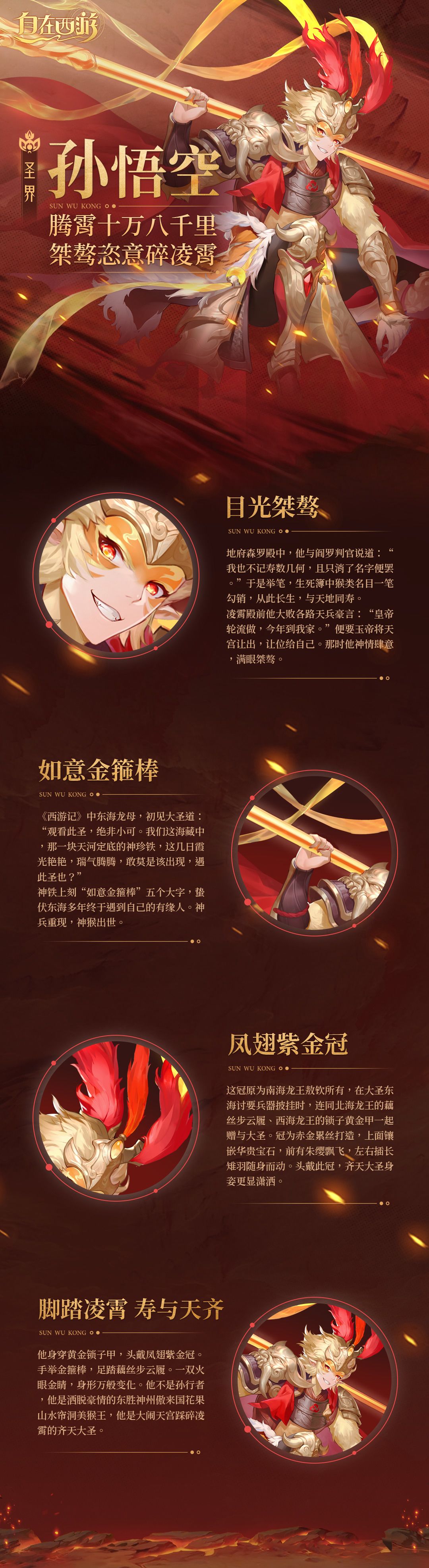 本为女娲补天石吸收日月精气之后的化身,化成生灵后坐镇花果山水帘洞结交各路妖魔誉为美猴王。