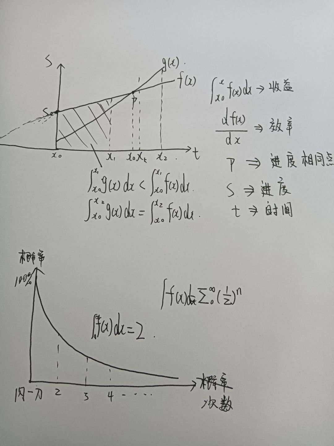 和追车比赛不一样的是,洗髓池有道童收益,我前面说过,道童是永久领先收益,那么把这个因素考虑进去就要好好算算了,否则无脑堆肉多好。我们根据追车问题可以画出两条函数图f(x)和g(x),两函数交于p点。特别的,dg/dx>df/dx,那么可预见于p点前g<f,反之亦然,也就是说p点后如果其导不变,你们f(x)将永远领先于g(x),这就是为什么130后需要继续堆肉的原因,而肉就是影响其导的因素。到这里我们容易看出,道童收益是∫f(x)dx(上下限自取)和∫g(x)dx,我们很容易得出前者的积分是比后者大的,而积分代表道童收益,我们可以很容易得出结论,当p在130附近时,先洗髓后升肉的道童收益大于先升肉后洗髓,p大于130时更优,p小于130时优势减小。