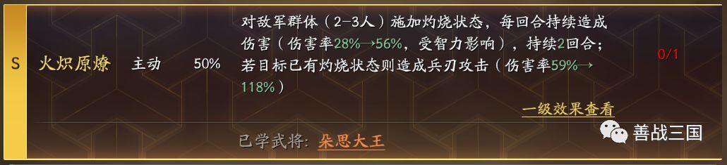 火炽原燎:可以联动毒泉和火神,火烧藤甲兵。带临机制胜也可以,只是放火会不稳定,后续对比测试后再分享给大家
