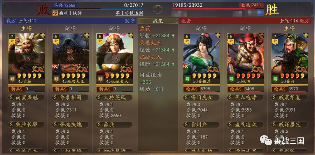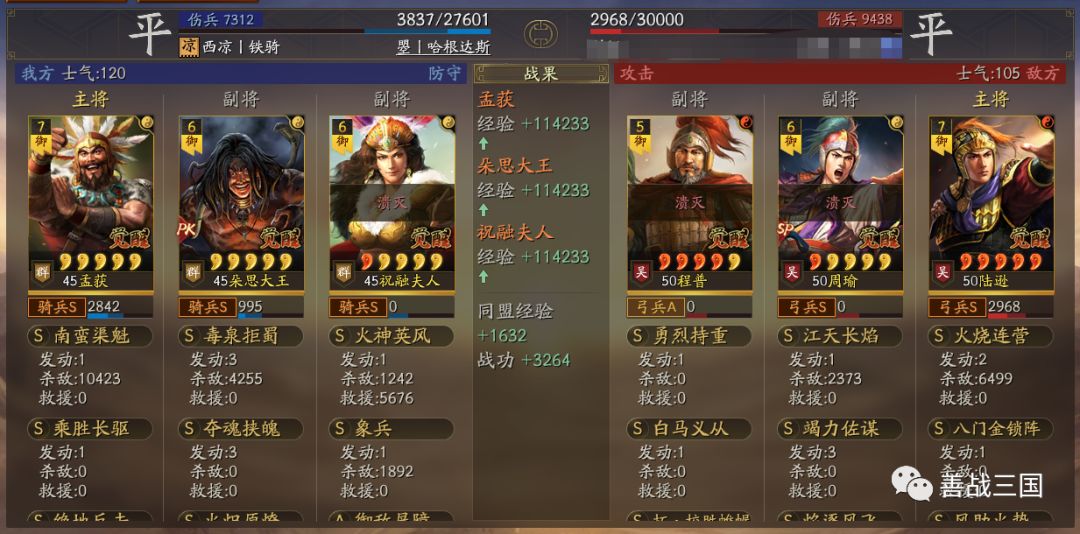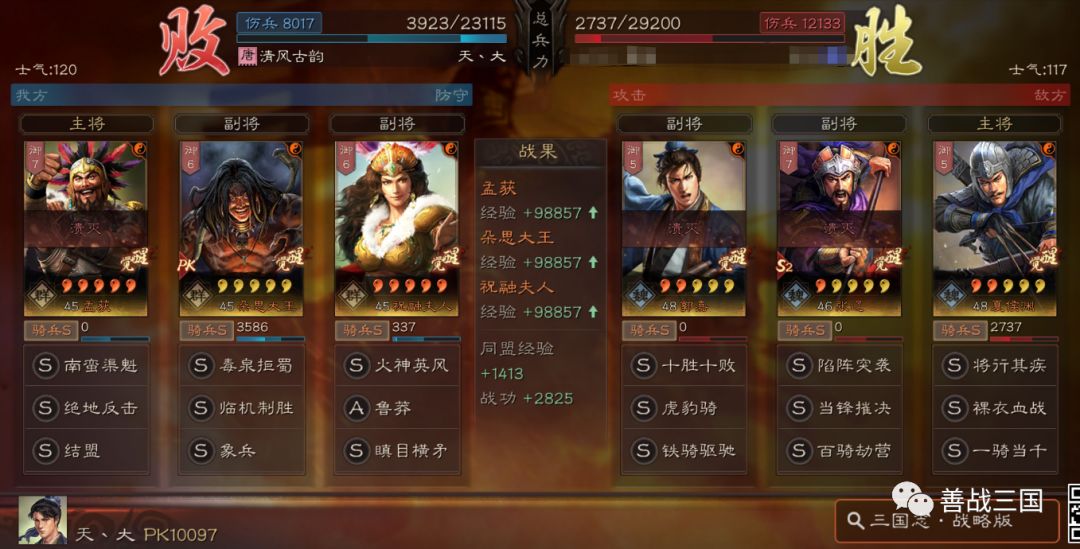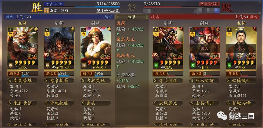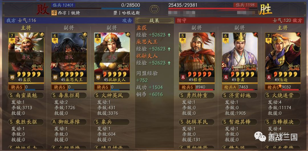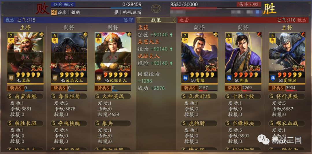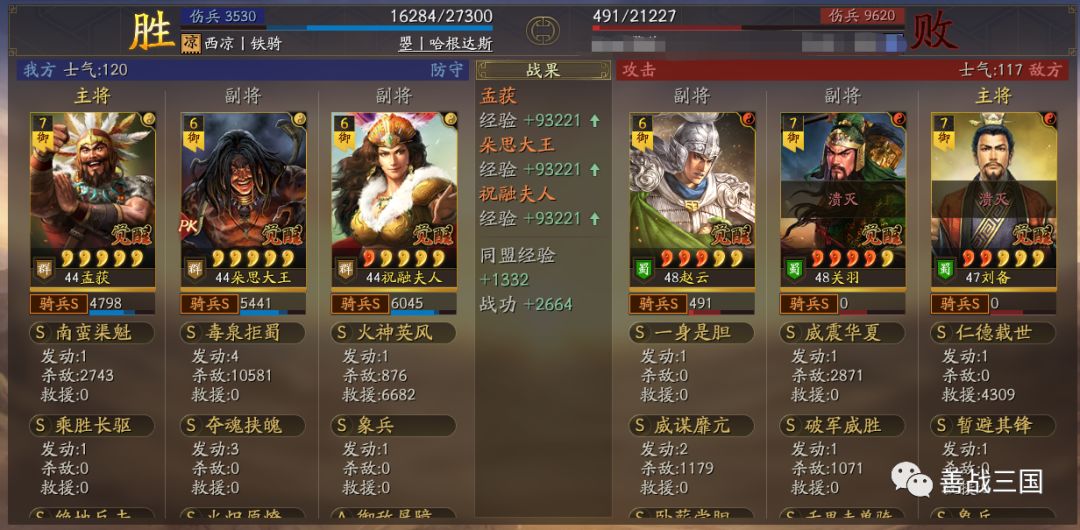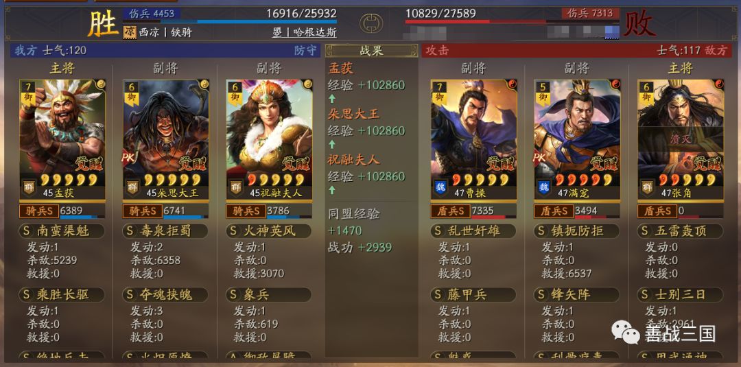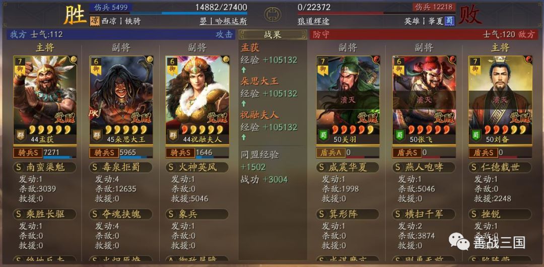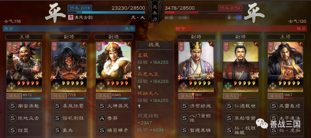 “南蛮骑”利用兵种克制打盾兵基本上没问题。战法使用上是大象+双伤+带火,可以克制绝大多数盾兵,下面我们爱看一组战报