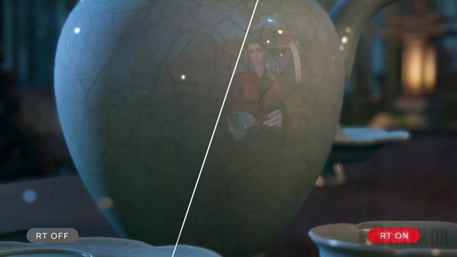 而在开启实时光追效果后,游戏引擎可以按照真实的光线反射规律渲染画面,侠客、竹林、天空倒映在水面中,除了静态水面反射外,游戏中刀剑金属表面也支持光线反射。