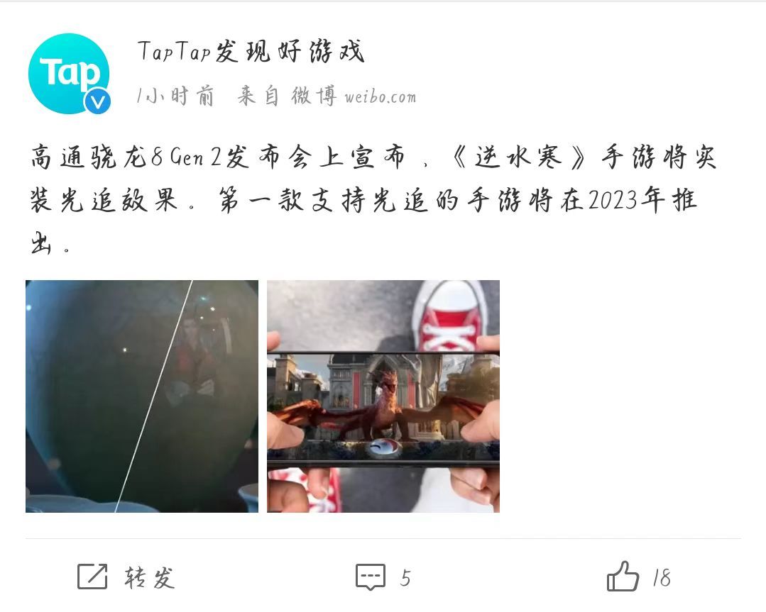 随即TapTap官微发文表示,”《逆水寒》手游将实装光追效果。第一款支持光追的手游将在2023年推出。”