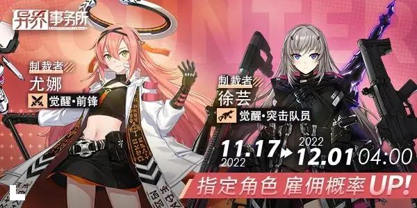 【注】管理局预计将在下周更新维护后(11.24更新维护后)开放黑色星期五主题周的秘密雇佣概率UP复刻。复刻将涵盖除觉醒徐芸、觉醒尤娜、觉醒杰克外的所有觉醒角色,复刻卡池均为单个角色的独立雇佣卡池。