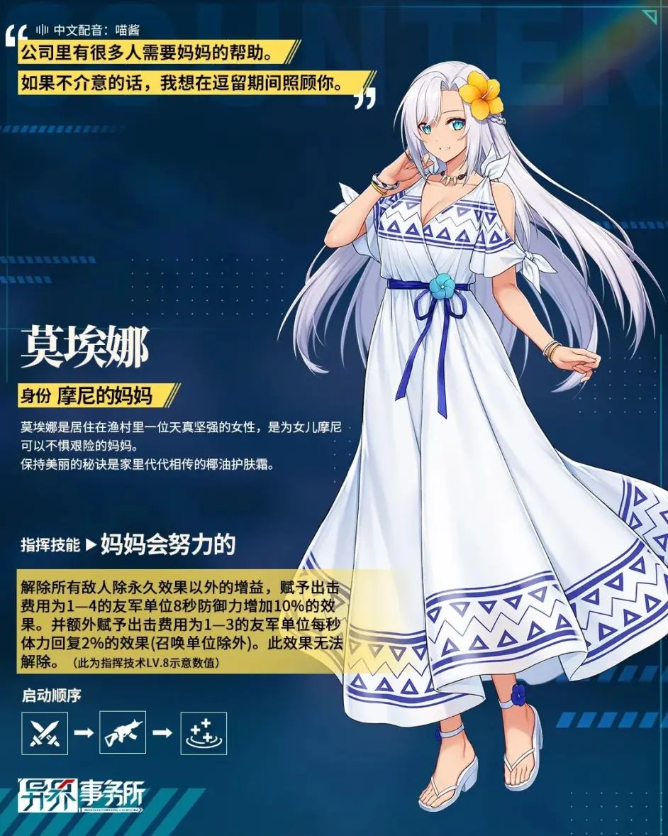 令人印象深刻的摩尼的母亲“莫埃娜”将以机务员的身份,参与未来的战斗。她的指挥技术不仅可解除所有敌人除永久效果外的增益,还可赋予部分友军单位一定的保命增益效果。本周更新后,新SSR机务员“莫埃娜”的机务员雇佣概率限时UP卡池将同步开放,老板可根据公司的战备情况前往雇佣。