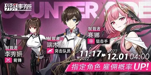 本周四更新维护后,管理局将面向特遣势力公司开放SSR李秀妍(未觉醒)、SSR端木熙(未觉醒)以及SSR赛娜的雇佣概率UP复刻卡池,供老板们扩充战斗实力。