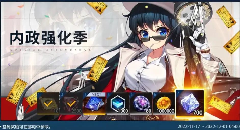 本周四更新维护后,管理局将为各特遣势力公司开放内政强化季主题登录签到活动。签到活动开放期内,老板每日首次登录游戏可自动获取与签到进程对应的礼物,礼物将发放至邮箱内。