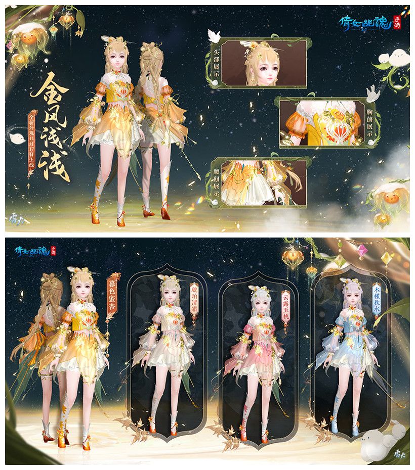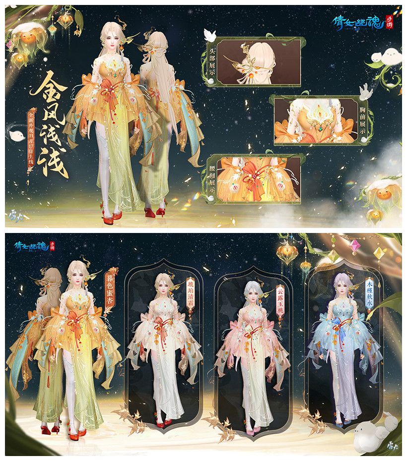 全新时装【金凤浅浅】伴随着梦幻的灯笼果坐骑【秋霜如蜜】随风降临!舞姿翩迁,漫天枫叶落满身,这一抹金黄似是晚秋的赠礼,亦是【金风浅浅】衣衫上的灵巧点缀。本次时装将以礼盒的形式出售,共有【暮色蜜杏】、【琥珀清霜】、【云露玉桃】、【木槿秋水】四款颜色,四色搭配各有韵味。秋韵浓,霜如蜜,灯笼果寓意吉祥,玩家们出游三界时记得乘上【秋霜如蜜】,将这份秋意珍藏心间。