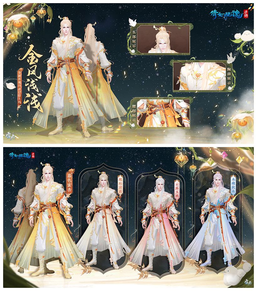 男款【金风浅浅】时装以落叶和流苏元素点缀。【暮色蜜杏】款以白色内衬搭配渐变的杏色流纱外袍,细款皮质系带衬出少年身姿。几簇绿叶红果饰品装饰衣衫与长靴,秋韵十足。异色男款时装同样气宇非凡,【琥珀清霜】配色更显绝尘,逸态横生;【云露玉桃】则增添了几分温润气质;【木槿秋水】如同翩翩少年,恣意潇洒。