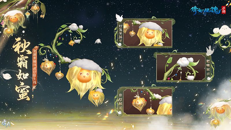 全新坐骑【秋霜如蜜】也将在11月17日同步上线!一盏小巧圆润的橙黄色小灯笼,搭配着绿色藤蔓与缤纷的彩灯。几只圆滚滚的肥啾趴于绿藤之上,祥云缭绕。乘上它,你就是三界中最亮眼的景色。全新时装【金风浅浅】与坐骑【秋霜如蜜】的巧妙搭配,则是这深秋最美妙的点缀,11月全新时装坐骑等你收入囊中!