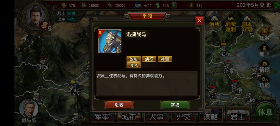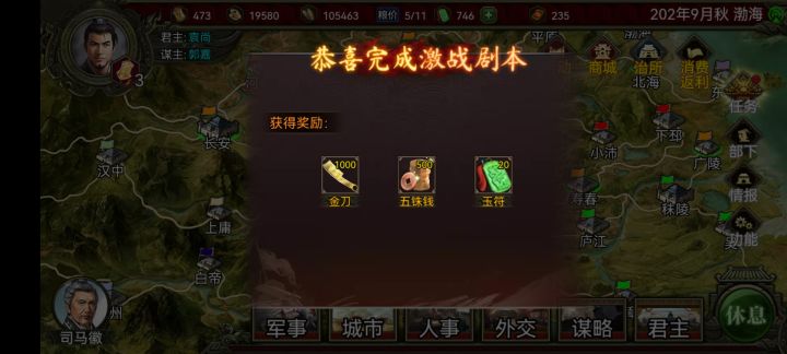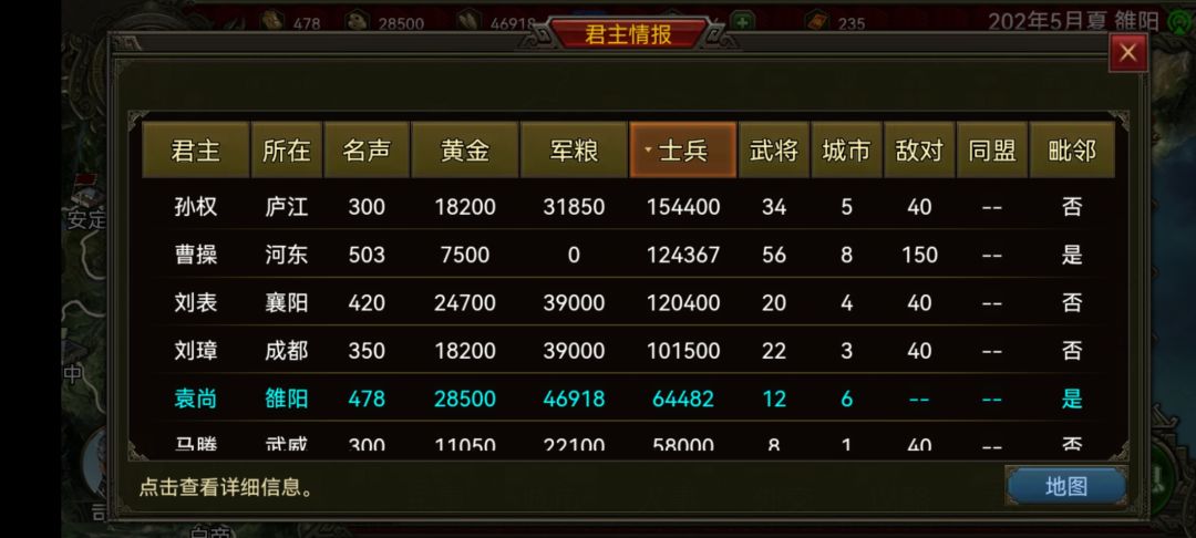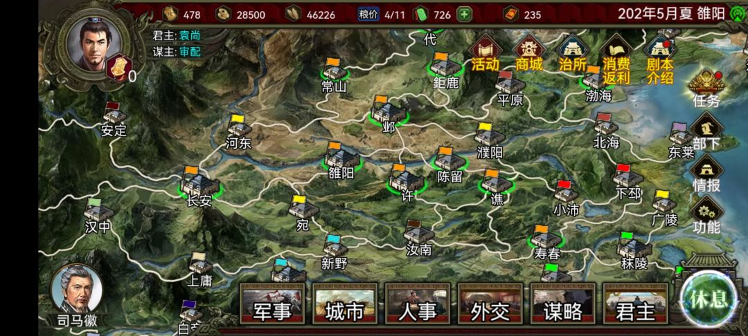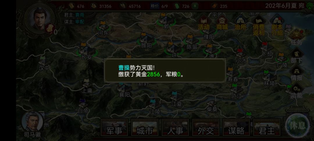 然后先拿许都和长安(这两城能买粮),然后就是剩下的城,如果来了5月加令的国庆和3个速行令,那6月就能灭曹操,没有可能就要7-8月了