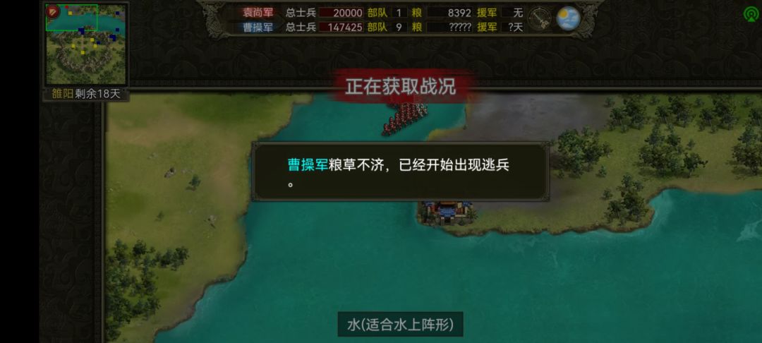 开局1人带上疾行马水阵直接打洛阳,曹操每过5天支援一批人,粮草消耗极大。用水阵在河里拖30天