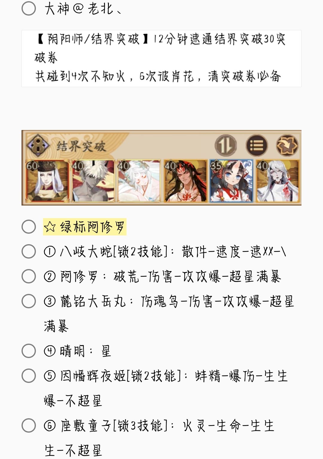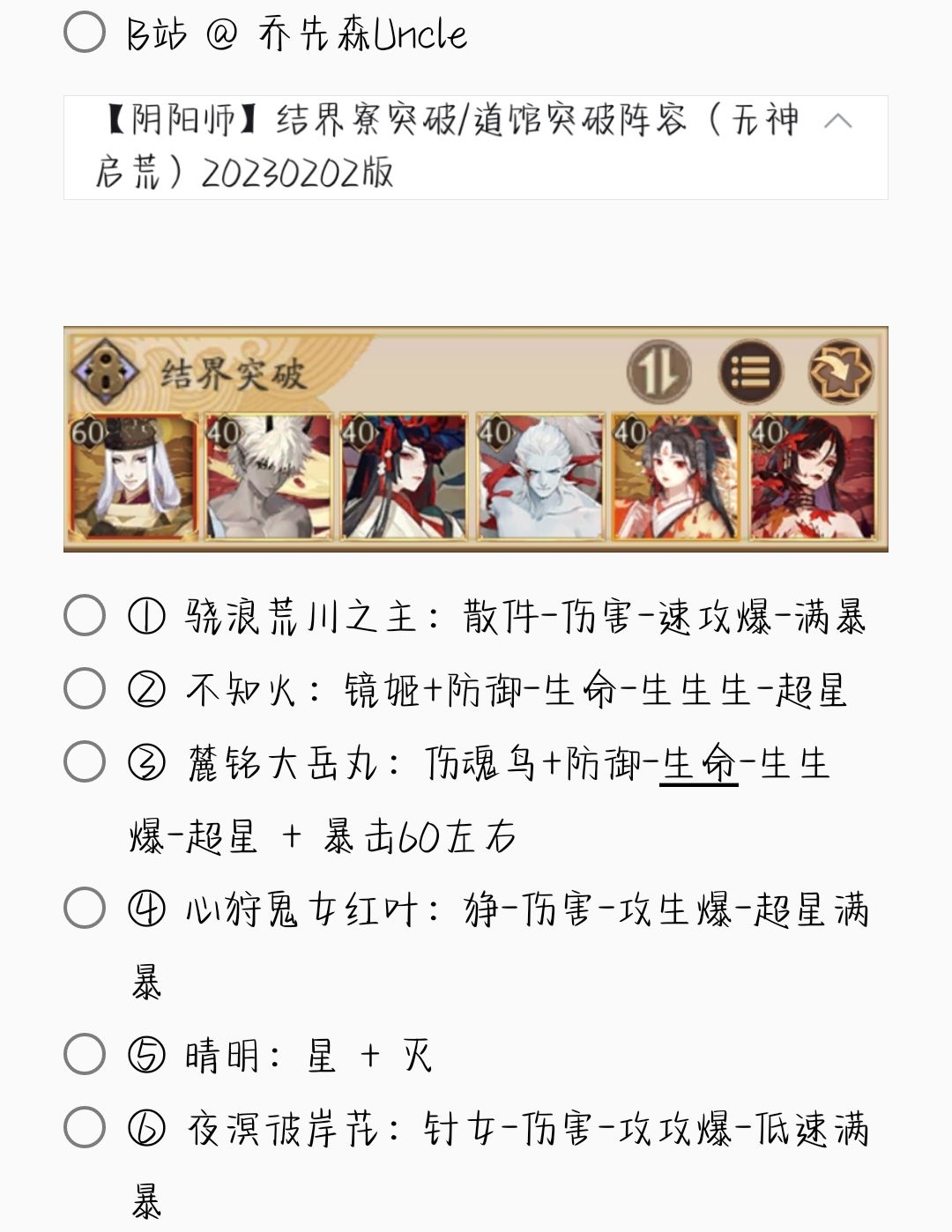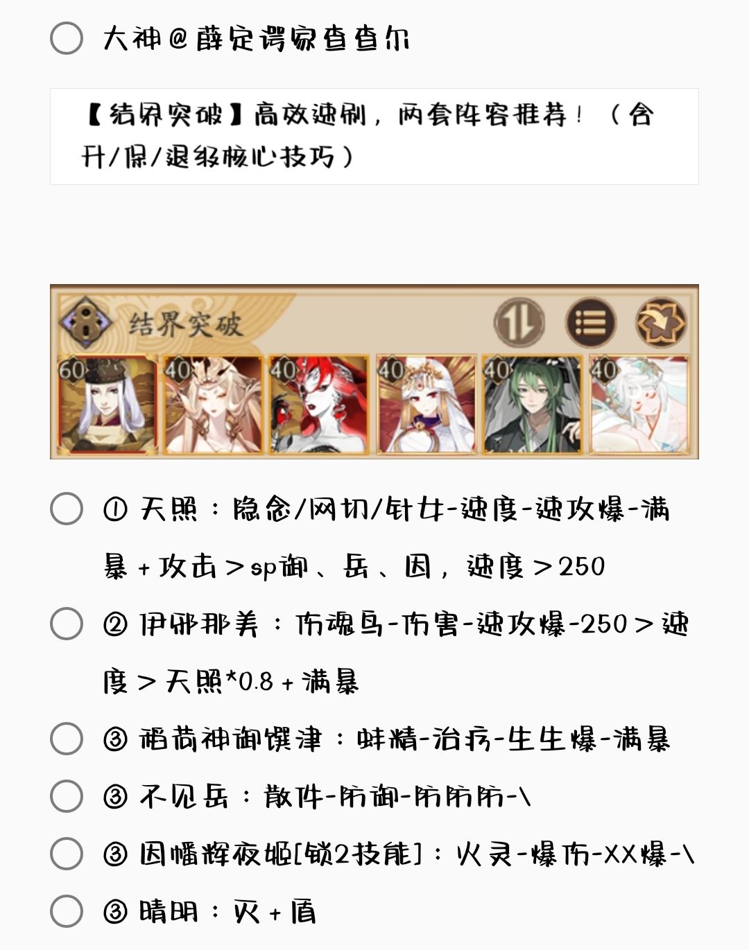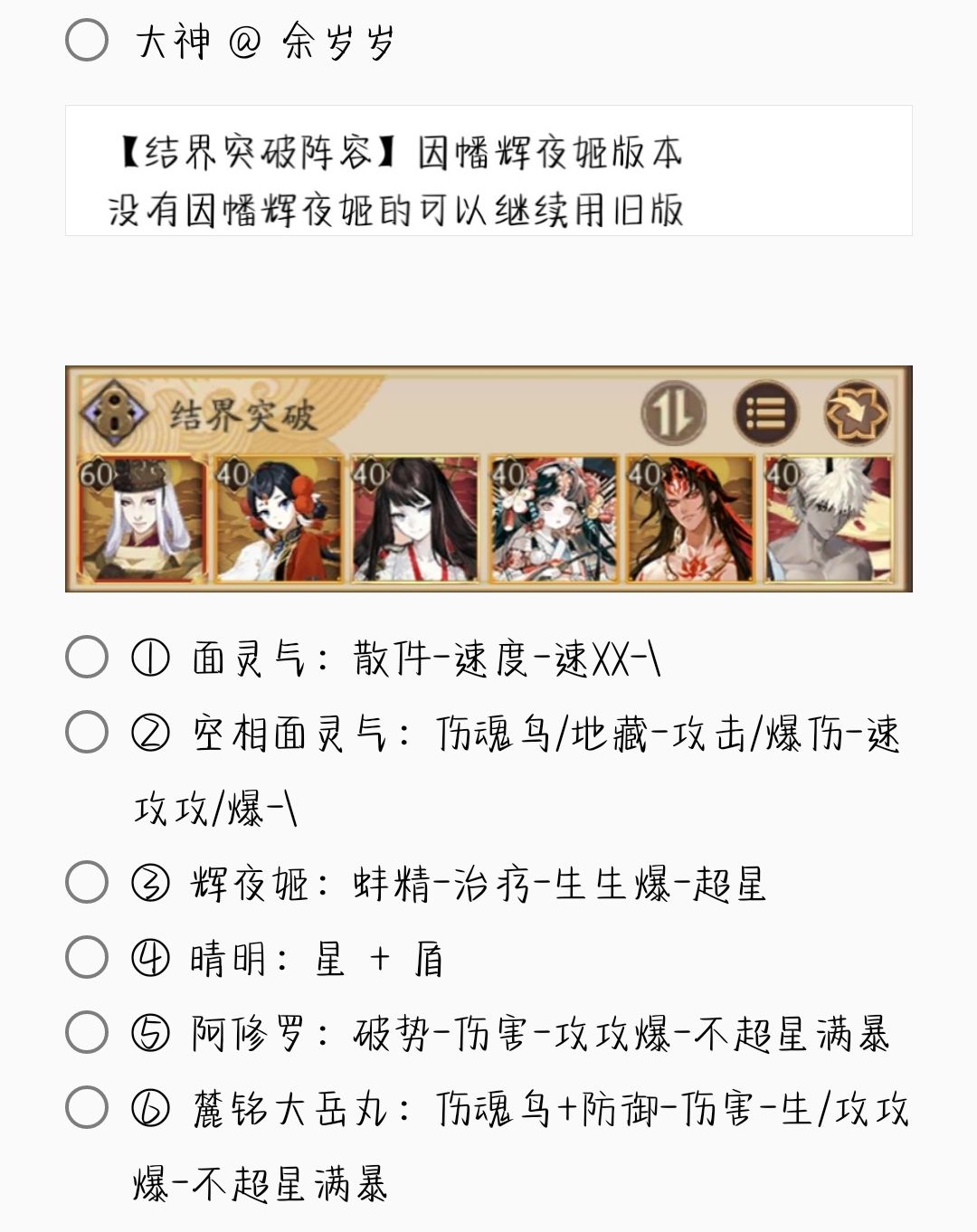 2. 若无特殊文字说明,阵容式神均需六星 + 满技能[151→至少满二技能,以此类推]