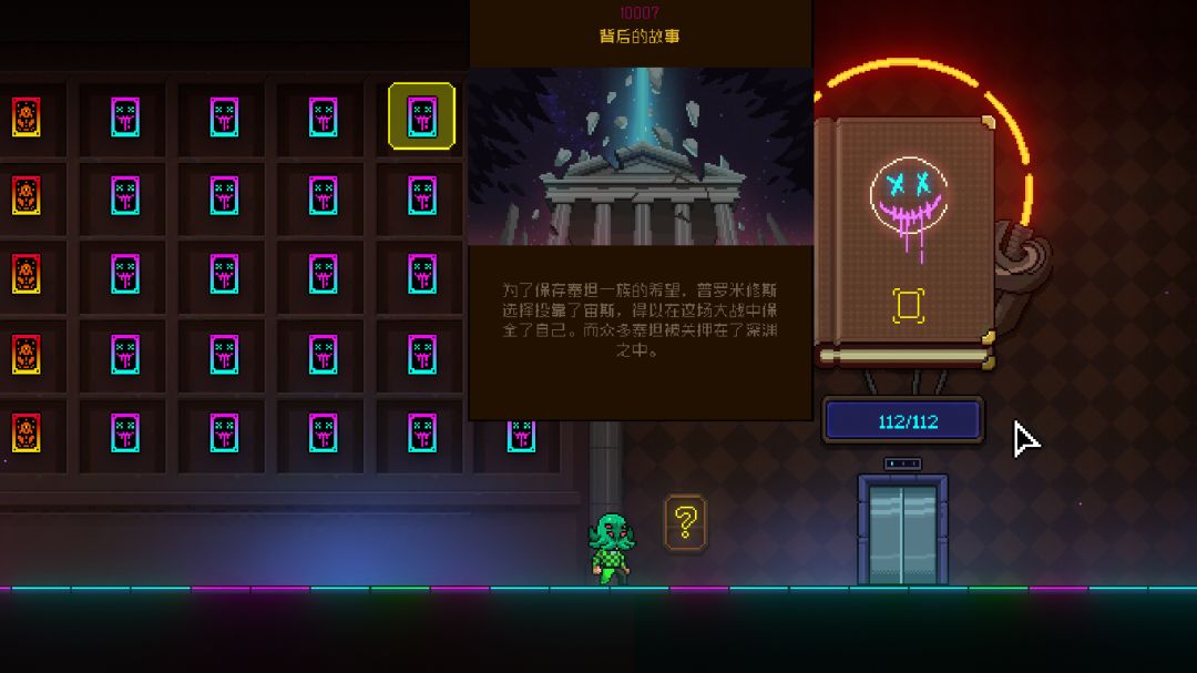 。旁边是一些涂鸦,文字可能是古罗马文字;看到小骷髅=$有着暗示主角做的事可能跟杀手有关,时间就是金钱的寓意,不过霓虹剧情这方面比较差,虽说肉鸽游戏一般都没有突出的剧情,但基本剧情就是复仇,击败高层管理,然后便不了了之了。这张挑战房的背景用的则是爱奥尼式罗马柱了,可以看出制作组是很用心的。挑战房比boos房还要难上一些,所以罗马柱也升级了更像是时代的更迭