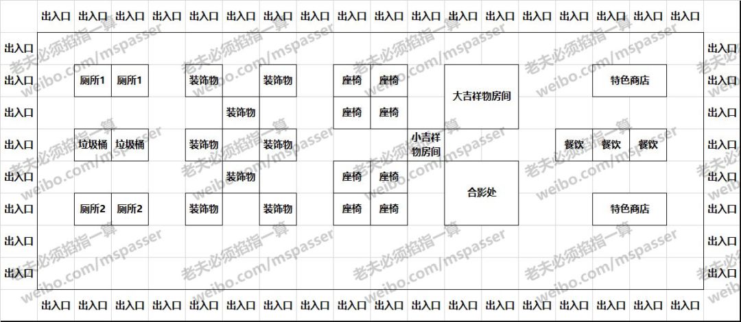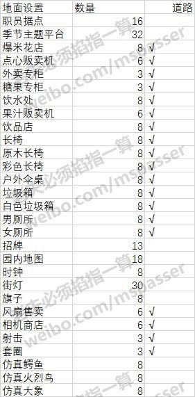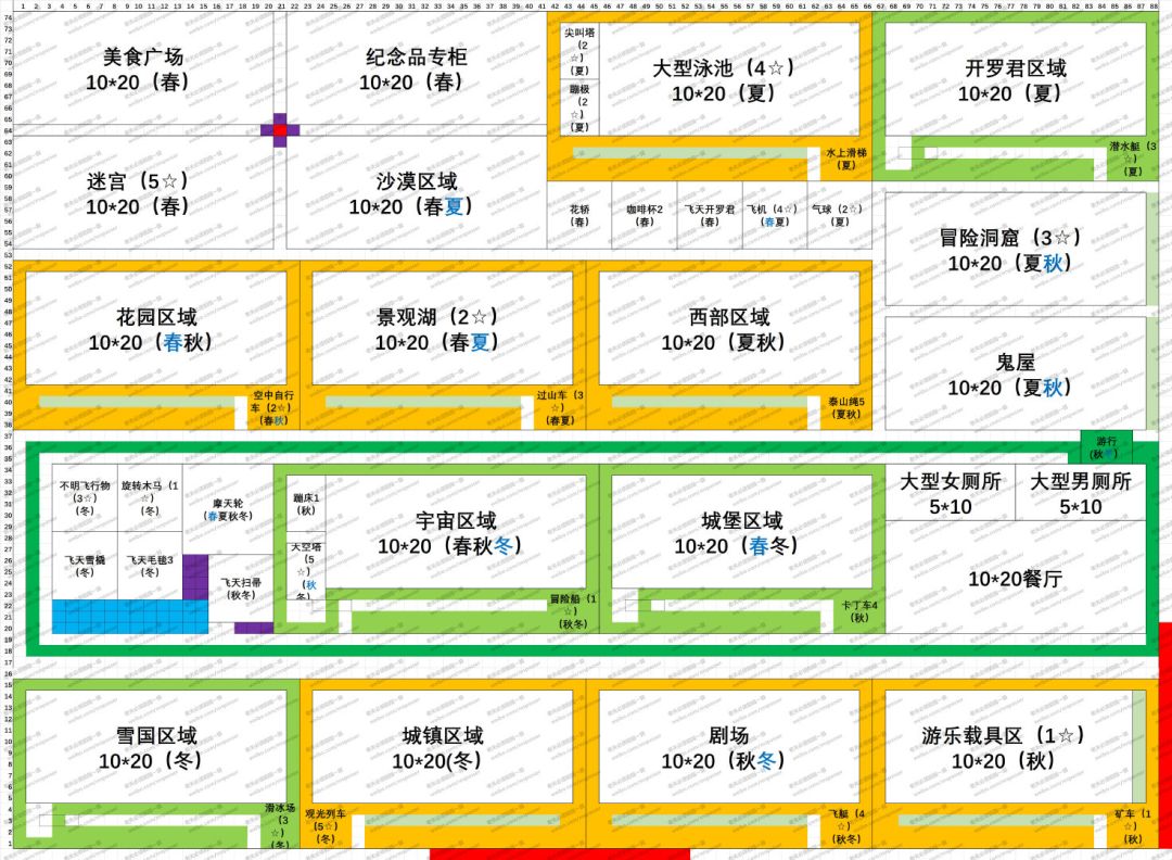 4. 面积类建筑都是10*20的布局。区域面积都是200,个别设施门口有买票处的,要减掉那部分,实际面积大概180+。
