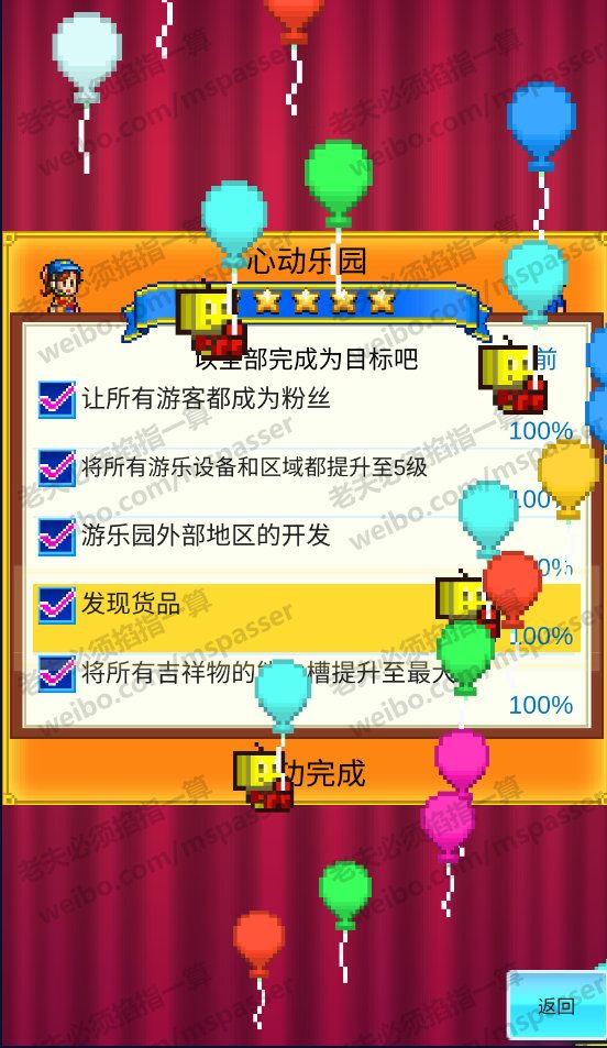 16. 游乐园五星后还有要求,全部实现后虽不能升级,但有开罗君拿着气球飘过庆祝。