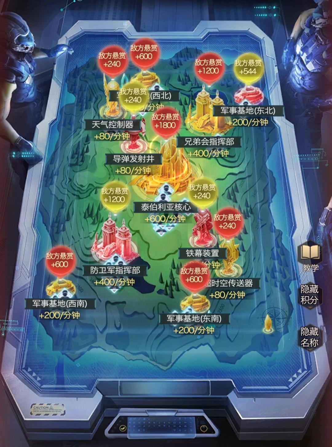 一,比赛开始之后,各方还是要第一时间抢占建筑,拿首次控制分抢占先机,首控之后,当一方持续控制某座建筑超过一定时间时(每座建筑分别配置),此时会触发悬赏机制,悬赏内容就是联盟的战斗积分。