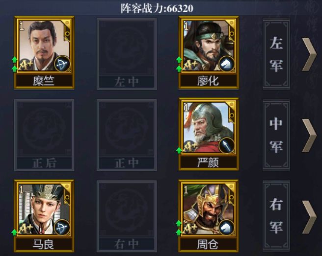 A+武将阵容:糜竺+马良+周仓+廖化+严颜
