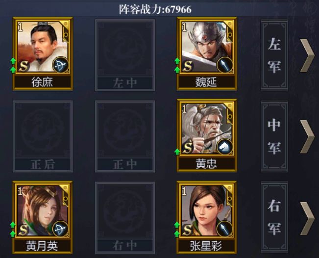 S武将阵容:徐庶+黄月英+魏延+张星彩+黄忠