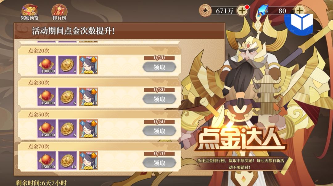 第一周排行奖励为点金奖励,每天三轮点金,一轮可点金(2+5+5+2)次,八小时刷新一次,有抢榜想法的萌新需要每轮点满14次(包括经验丹的两次),单轮点满需要550晶石,一天三轮需要1650晶石,如果不是为了抢前三(拿橙色饰品),按自己需求点满任务档位即可。