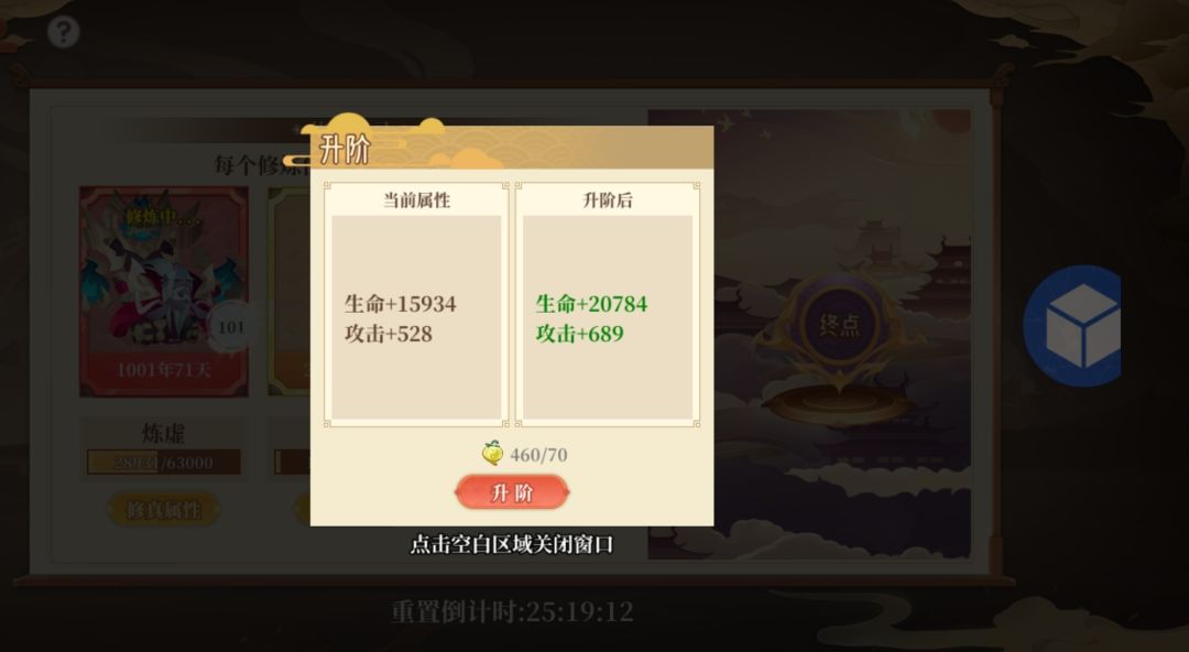 3.修真育灵:产出铜币/唤灵符/道心果(修真升阶材料)/灵石/打坐仙灵固定属性加成。开启后只让主力输出在一号位修真即可,灵识满了即可进阶。二号位三号位放任意100级以下仙灵升级升阶,到随意等阶后,大厅“仙灵光阵”“魔镜重生”二三号位仙灵,可做到主力输出一卡吃三卡的灵识产出,尽快进阶到顶拿全固定属性加成。修真三天一轮,拿奖励的话直接快速战斗然后跳过即可,其他的道友们慢慢体会,注意第三周之后刷新前提前脱掉主力装备(减难度),要不然可能会拿不全30关奖励(括弧笑)。