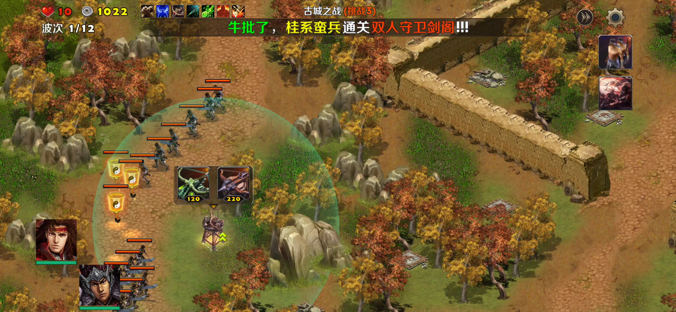 打法思路:开局太史慈周瑜中路交汇处守着,上下两个出兵口建造剧毒箭塔把技能都满上,第二波上路会出小boss蔡阳周瑜投个技能配合剧毒箭塔就可以解决他,第四波投石车出现要么英雄去打掉要么卡片里带一个塔基加固防御塔回血,第七波上下两路各出一个boss英雄逐个击破或者拖住让防御塔打,第十波投石车还是一样灭掉他家里建造狙击箭塔狙击点满,最后一波夏侯惇,英雄集合就可以秒他