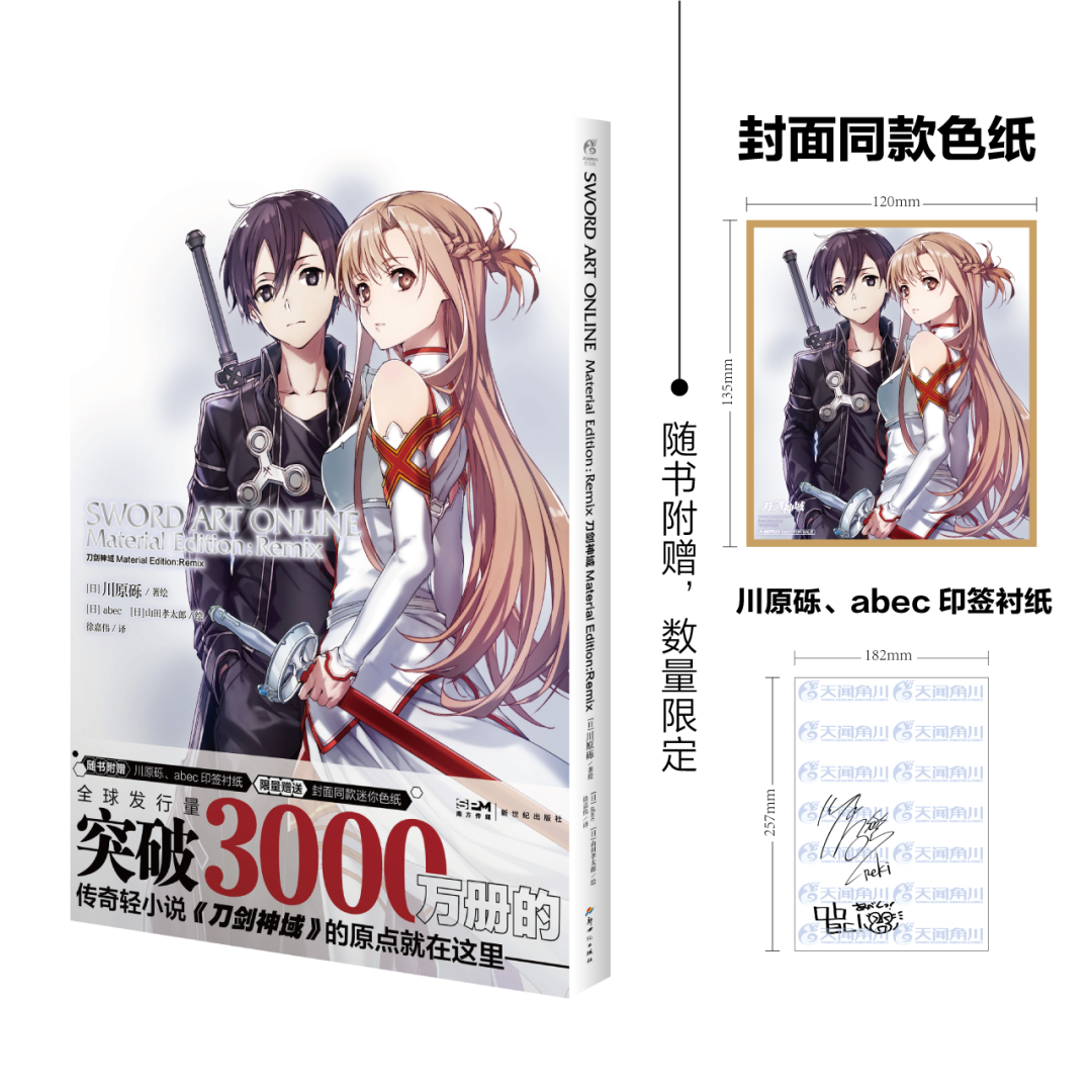 Material Edition是指作者川原砾在《刀剑神域》正式出版前后以“九里史生”名义在网络和线下展会发布的纸质版番外短篇和早期设定,本次将这些作品集结成册,还加入了山田孝太郎全新绘制的短篇漫画,读者可以从中窥见该系列作品的雏形,十分具有纪念意义。