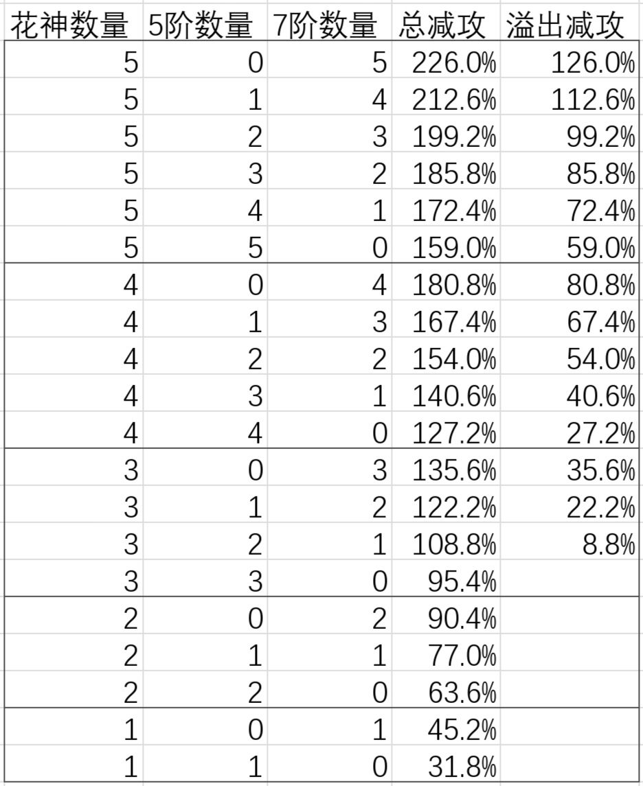 二、减攻叠加表(仅考虑花神三技能7级和10级)
