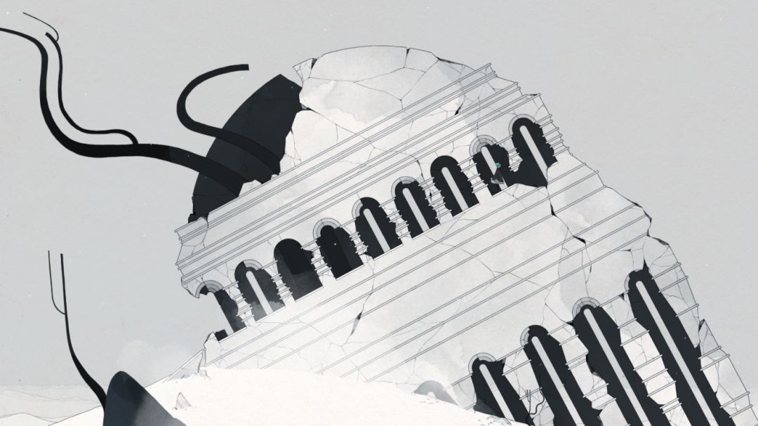 荒芜的大地、干枯的树木、倒塌的宫殿、都在预示着格莉斯的内心崩溃。黑白的配色没有一点色彩,预示着格莉斯的内心也是一片灰色,崩溃、压抑占据了格莉斯的内心。