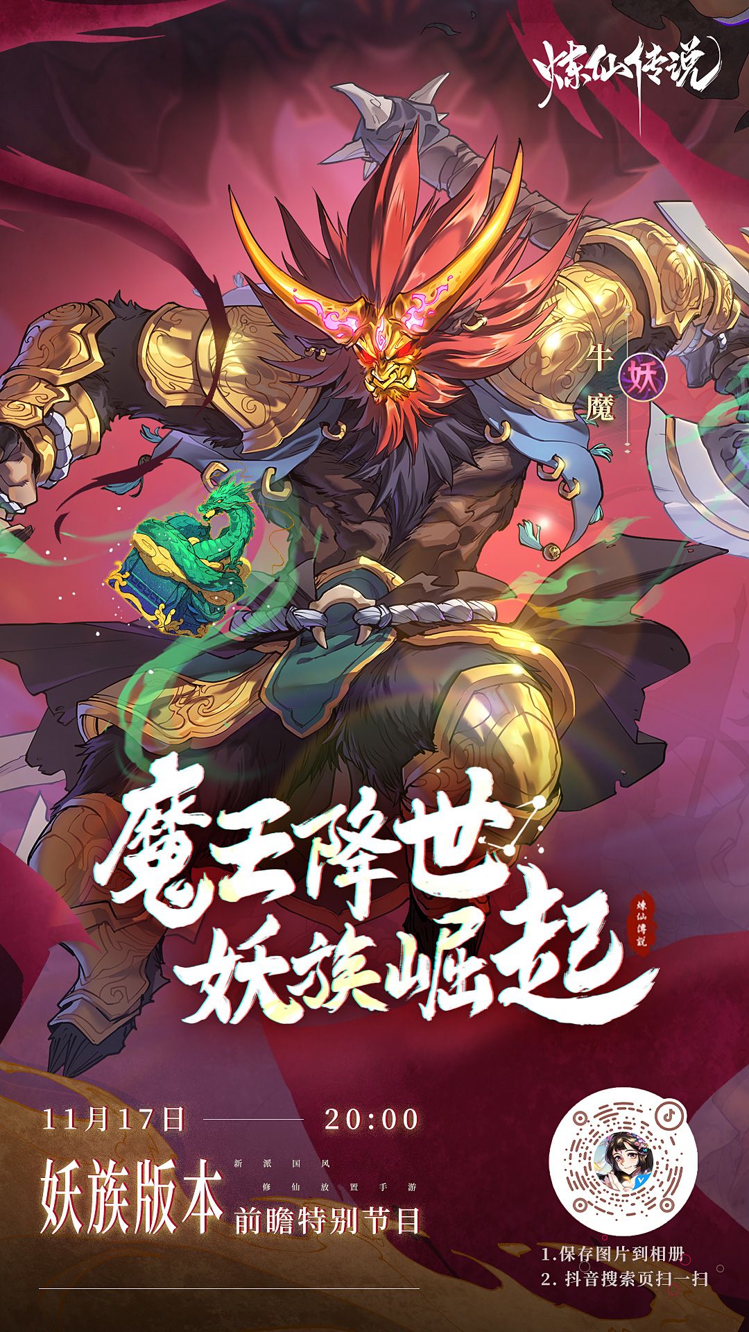 今晚(11月17日周四)20:00,来炼仙传说抖音官方直播间妖族版本前瞻特别节目!!!