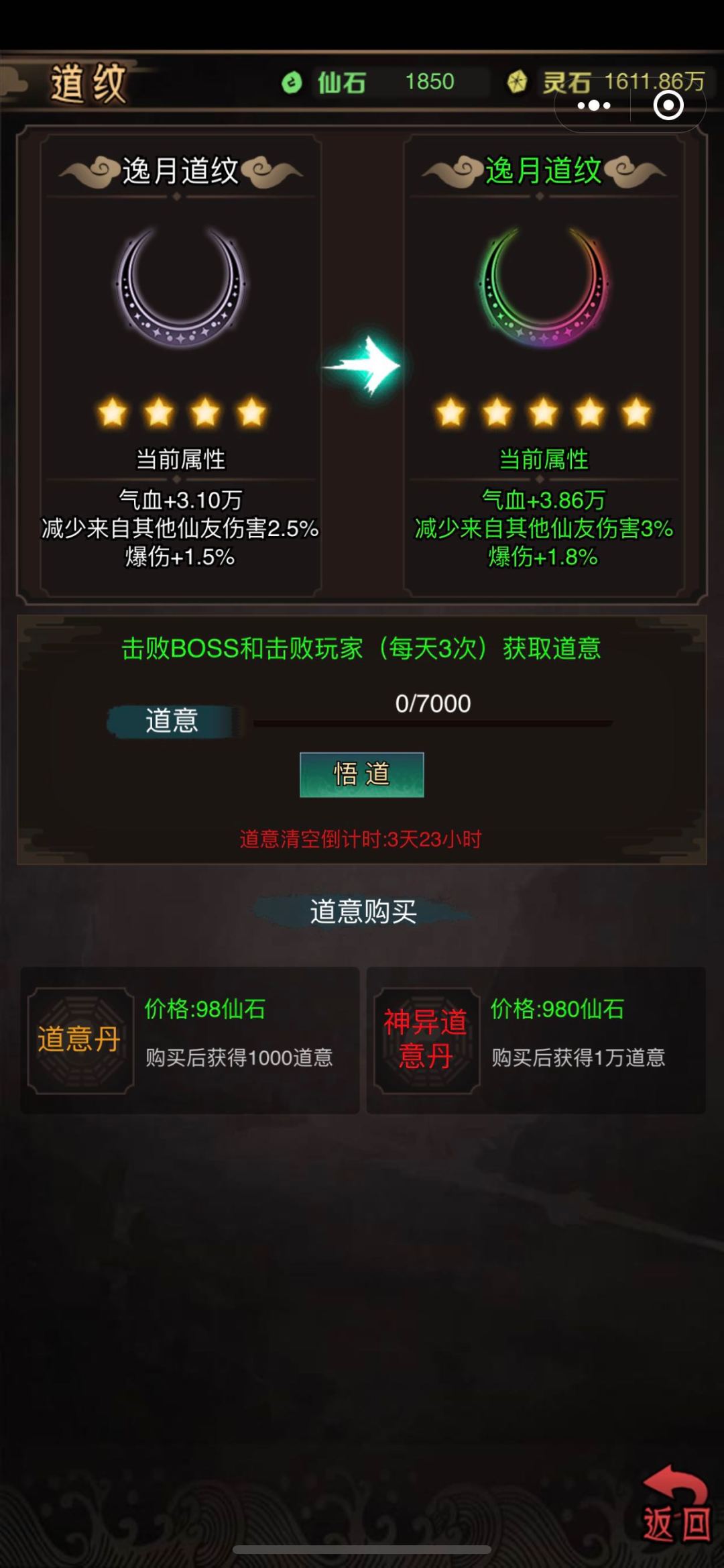升级道纹可更改角色在战斗中身后的道纹形象,同时增加大量气血以及特殊属性,提升道纹需要消耗道意值,通过每日参与大道之争击杀BOSS获得,每日前三次击杀的BOSS根据类型获取不同数量的道意,其中跨服BOSS所能获得道意最多,每日前三次重伤其他道友也可获得道意值,道意值获得后请及时提升道纹等级,道意存在一定时间后会被清空,具体请查询道意界面倒计时显示,避免获得的道意被清空。