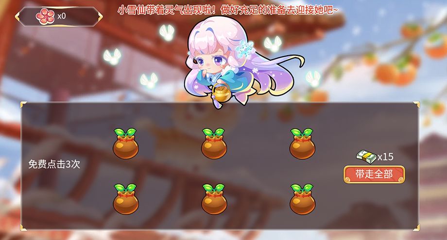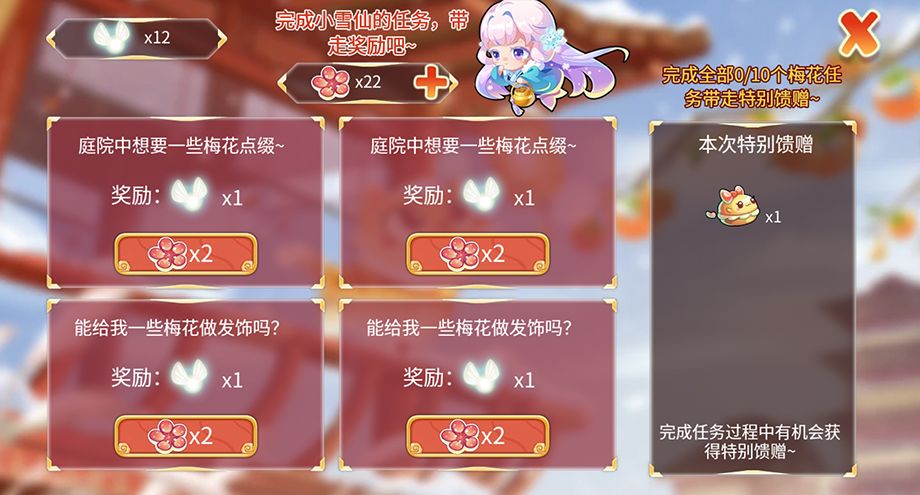 将梅花送给小雪仙,换取灵气,完成全部任务还可以带走特别馈赠~