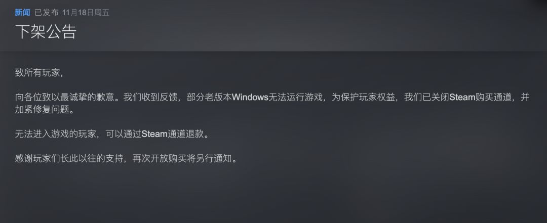 11月18日,官方公告称很多玩家反应老版本Windows无法正常进行游戏,所以暂时下架修复问题,无法运行游戏的玩家可以提交退款申请。