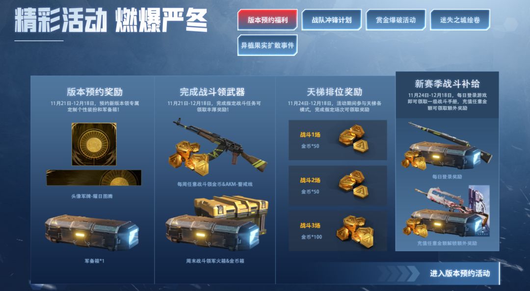 全新赛季征程再启,作战冲锋赢好礼!11月24日至12月18日S3赛季期间,每日登录游戏即得一级战斗手册。玩家可结算S2赛季奖励并继承一定程度的天梯段位,参与S3荣耀天梯与墨金挑战活动,达到指定段位并累计战斗场次领取赛季奖励。同时,加入城市赛正式战队解锁冲锋计划,完成战队冲锋任务,能增加计划等级领取相应的等级礼包。S3赛季还将新增赏金爆破模式与地图「霓幻山城-白昼」,带来强竞技性的游戏体验。