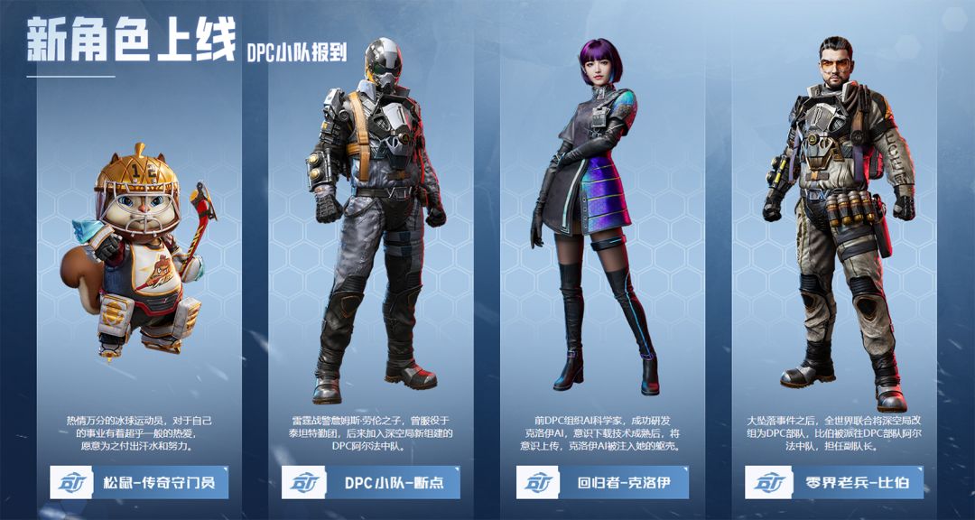 全新组织DPC小队登场,成员断点、老兵比伯与前小队AI科学家克洛伊前来报道!大坠落事件后,全世界联合改组成立DPC小队以有序管理、合理开发并利用星尘物质。角色克洛伊的外观造型与她的身份有着同样的科幻感,炫酷紫发搭配霓虹色泽皮质短裙,颇具赛博朋克气息;两位男角色则全副武装,时刻严正以待迎接战斗的到来。另有大头角色松鼠加入,展现传奇守门员的英姿。