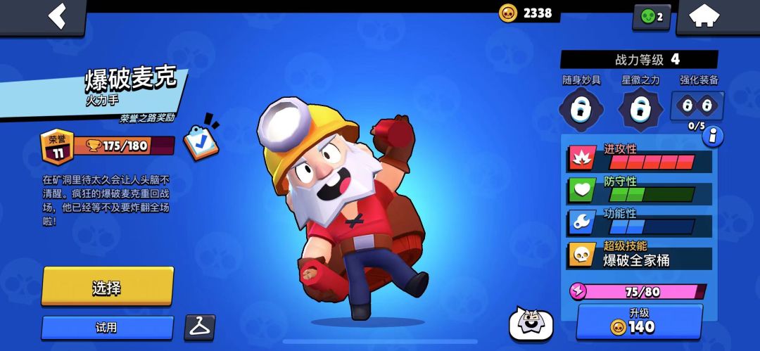布洛克的技能是在普攻爆炸的范围内留下火焰伤害敌人,最低也增强了伤害,但是这点伤害也可有可无,可以封路(虽然这点伤害不痛不痒),最大的作用其实还是帮助超级技能充能,因为超级技能到最后总会差一点点充满,还有就是吃鸡模式可以三发打掉箱子,推荐程度★★☆☆☆(如果对大招有用就很***)麦克