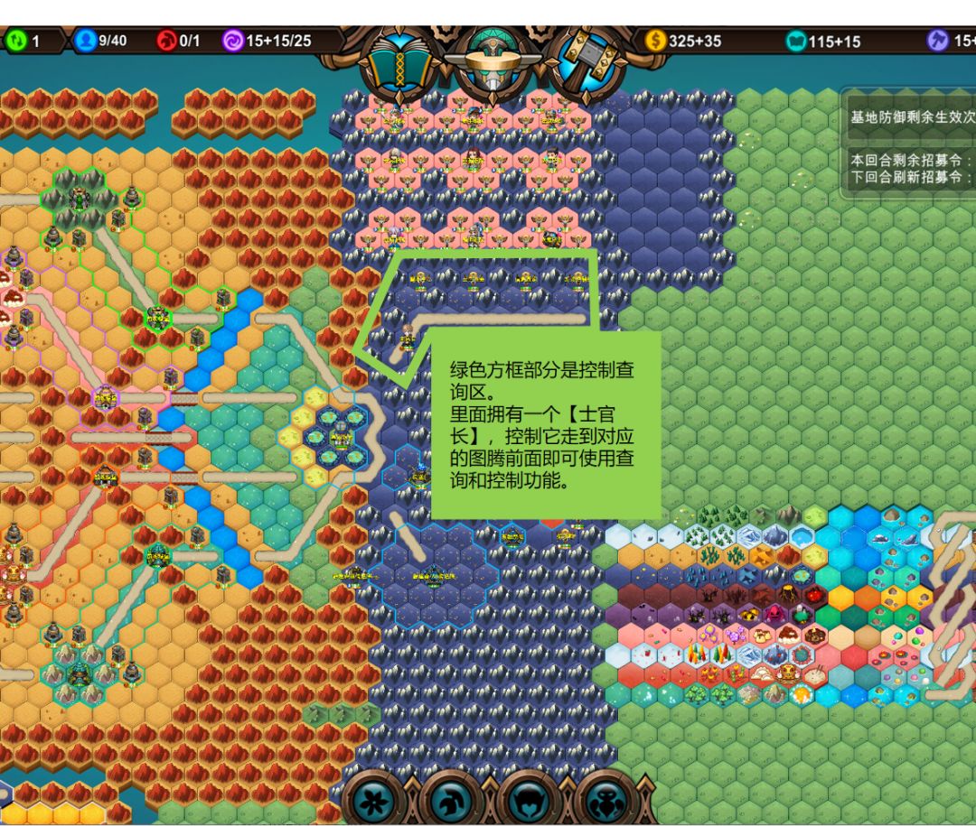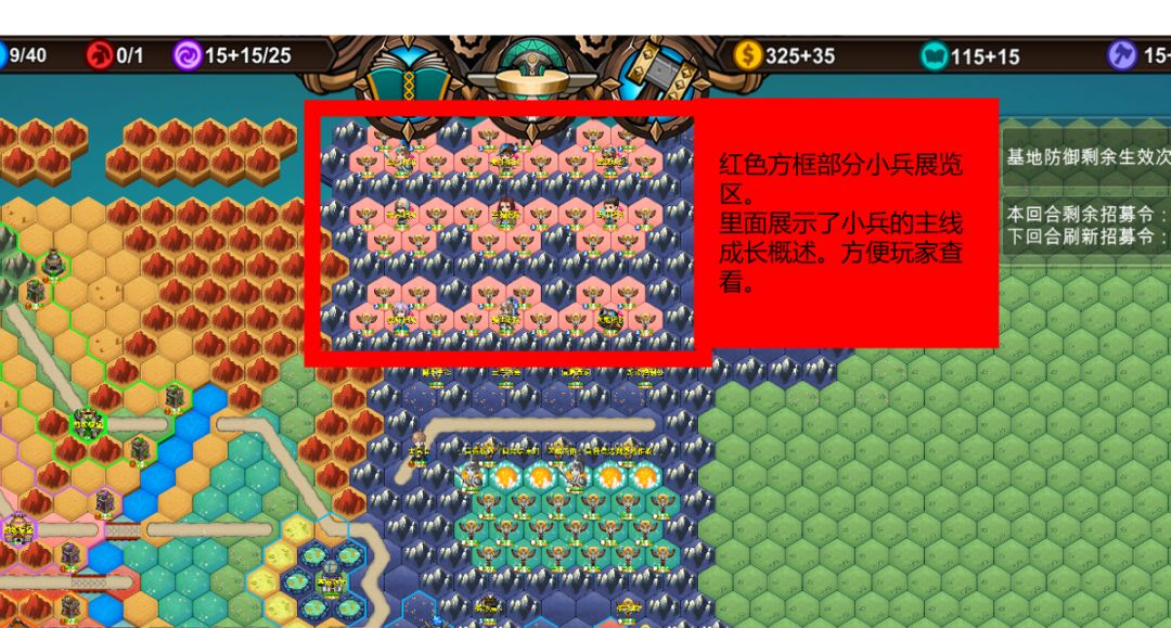 这里用于展示功能的体现,比如基地防护生效次数、招募令、任务、或者一些游戏信息都是在这里显示。