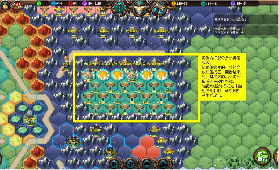 从菜单购买的小兵将会放在备战区,回合结束时,备战区的小兵将会传送到主战区作战。