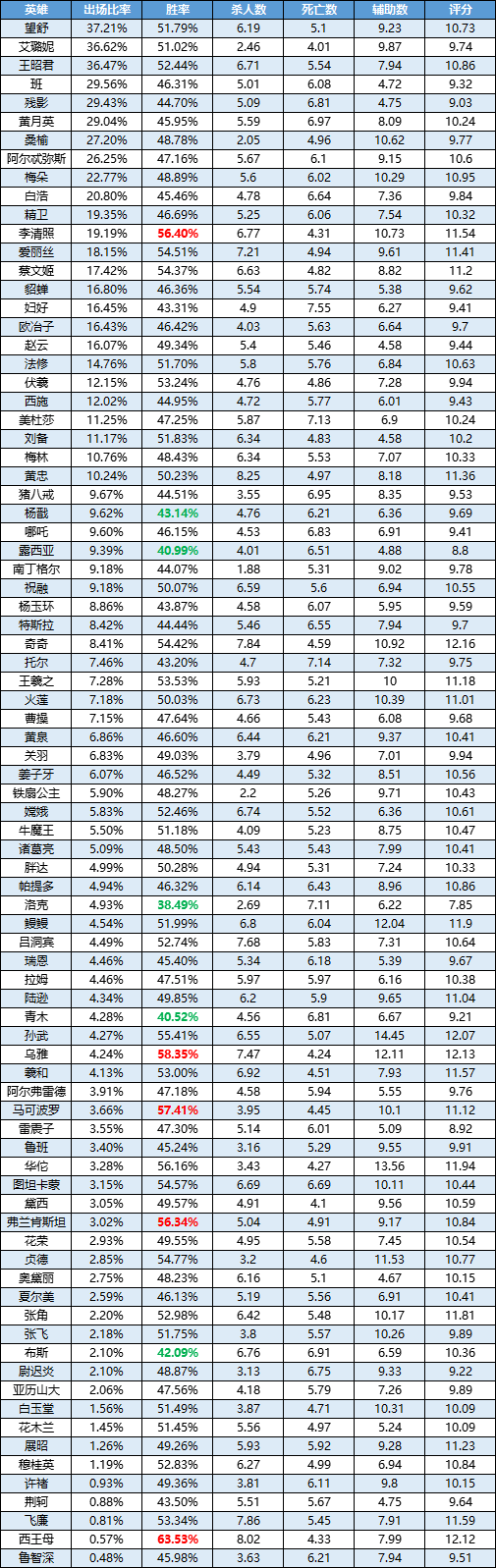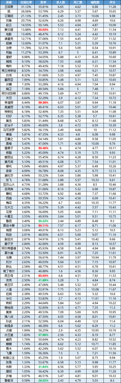注:此榜单按出场率由高到低排序,标红为胜率前5的英雄,标绿为胜率排名倒数的英雄