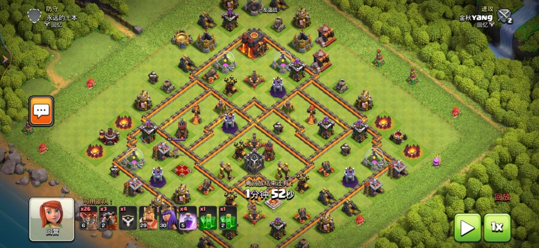 由于他的部落5级以上,纯9本是不能用高援的,所以我不用高本兵种去打。