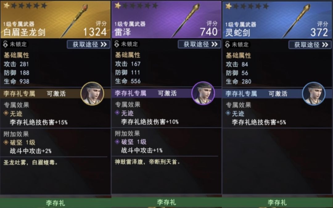 李存礼专属武器绝品武器:白眉圣龙剑。专属效果无迹(绝技伤害+15%),附加效果破坚(战斗中攻击+2%)