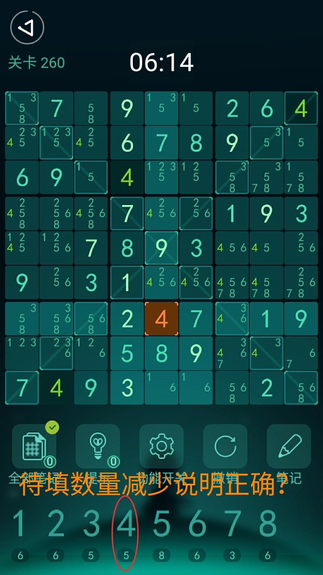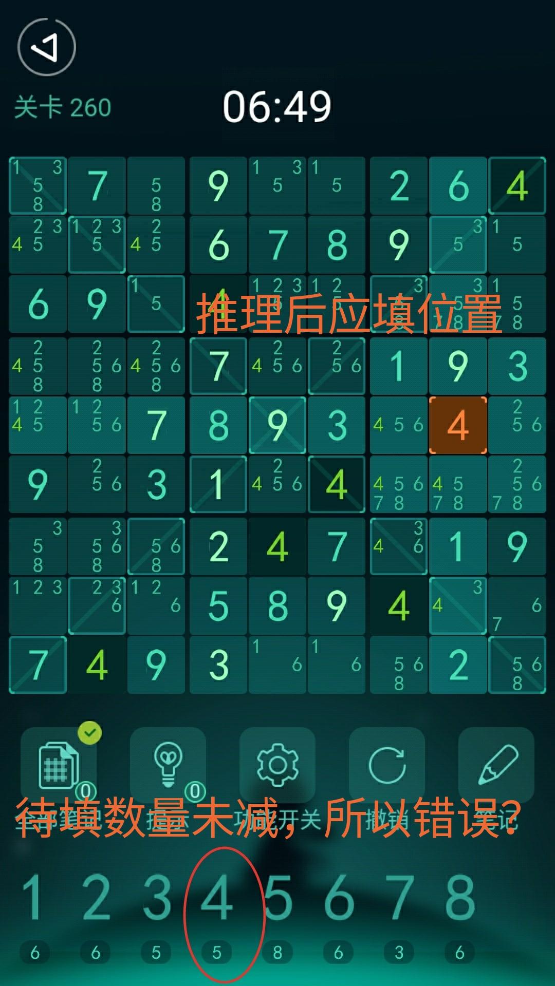 对角线260关,重试了好几次,最后点开系统提供的全部笔记推理还是一样,4这里应该是bug?如图所述,等待解惑。